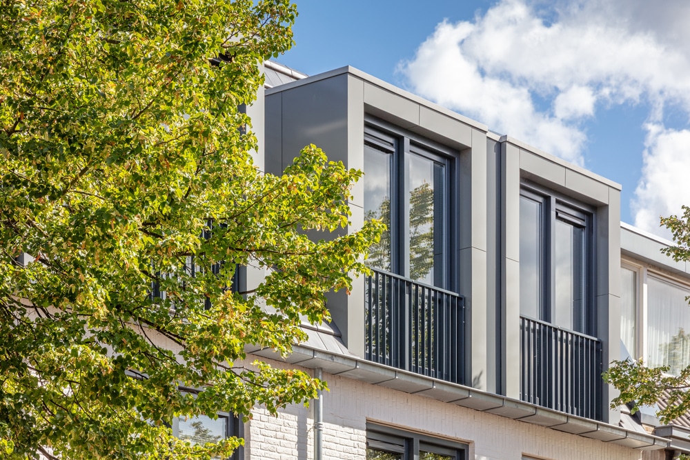 De verticale kozijnen met Frans balkon en de dakkapellen benadrukken de hoogte van het pand.
