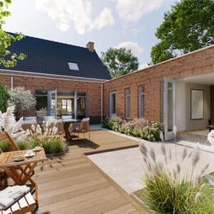 Aan de Kraan in het Brabantse dorp Berkel-Enschot is een ontwerp gemaakt voor 6 levensloopbestendige patiowoningen. De woningen worden ontsloten door middel van een ruim opgezet woonerf met een groen karakter.