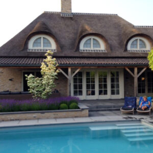 Dit riant vrijstaand woonhuis heeft alle kenmerken van een rustieke landelijke villa. Een rietgedekte kap, gevels van ambachtelijk metselwerk, afgewisseld met beschietingen van zwarte gepotdekselde houten delen.
